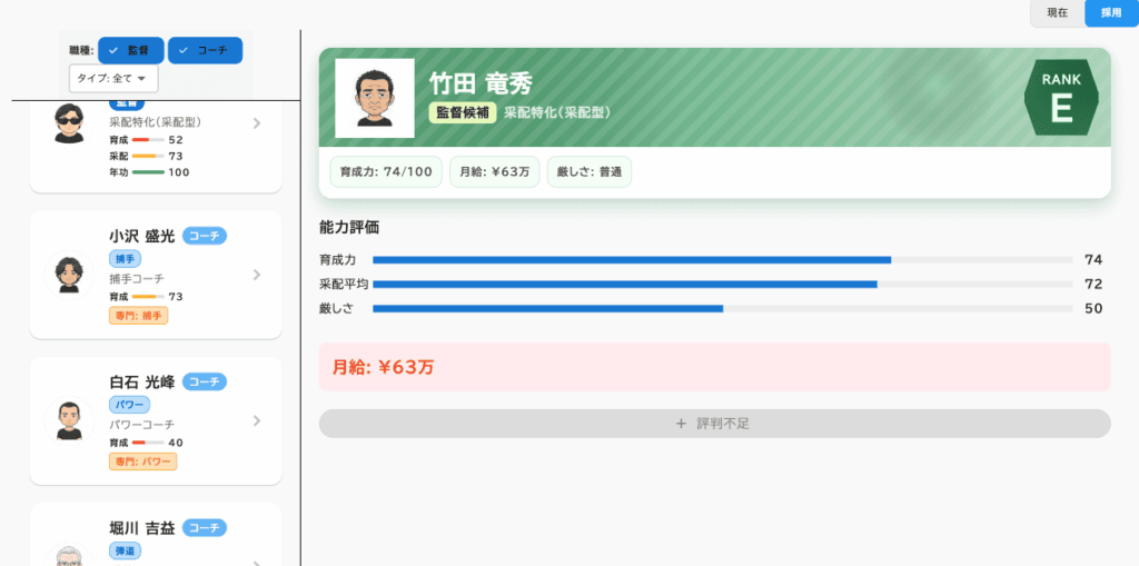 採用タブには市場にいる候補が表示され、年齢、得意分野、給料目安などを比較して採用判断ができます。採用は長期投資となるため、チームの財務状況や育成方針と照らして決定します。